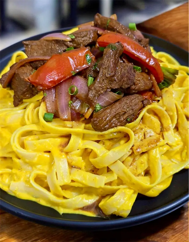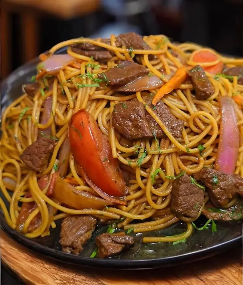 Trozos de carne salteados al wok con cebolla, tomate y especias peruanas, servidos con arroz y patatas fritas.
